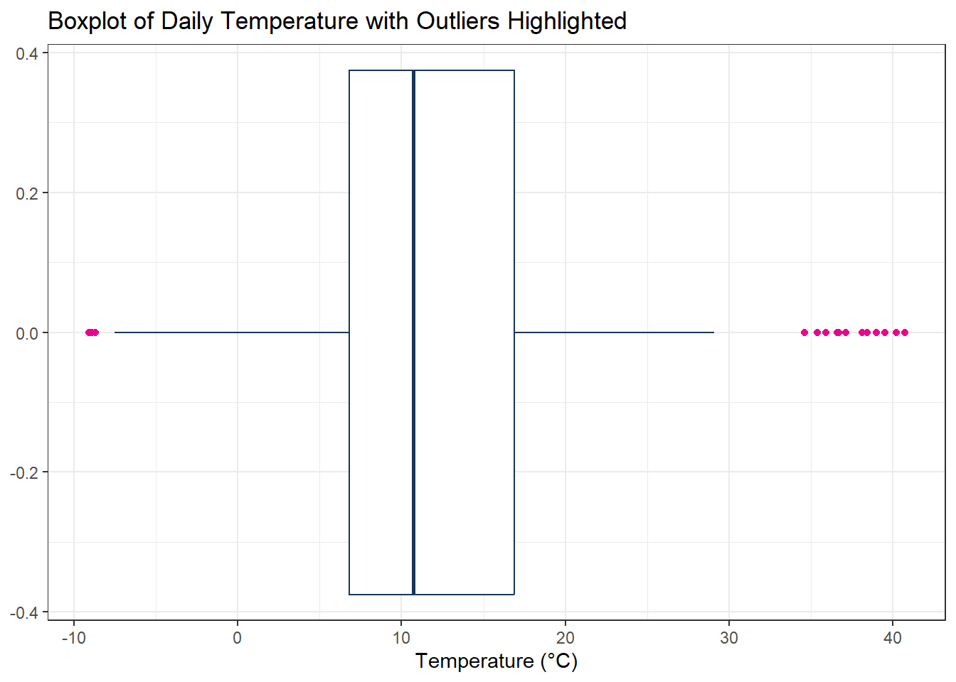 While summary statistics offer a general overview, a closer look is often needed to assess data quality. Unusual or extreme observations (outliers) may appear in statistical summaries but are not always immediately evident. The goal of this section is to identify, visualize, and handle such anomalies appropriately.