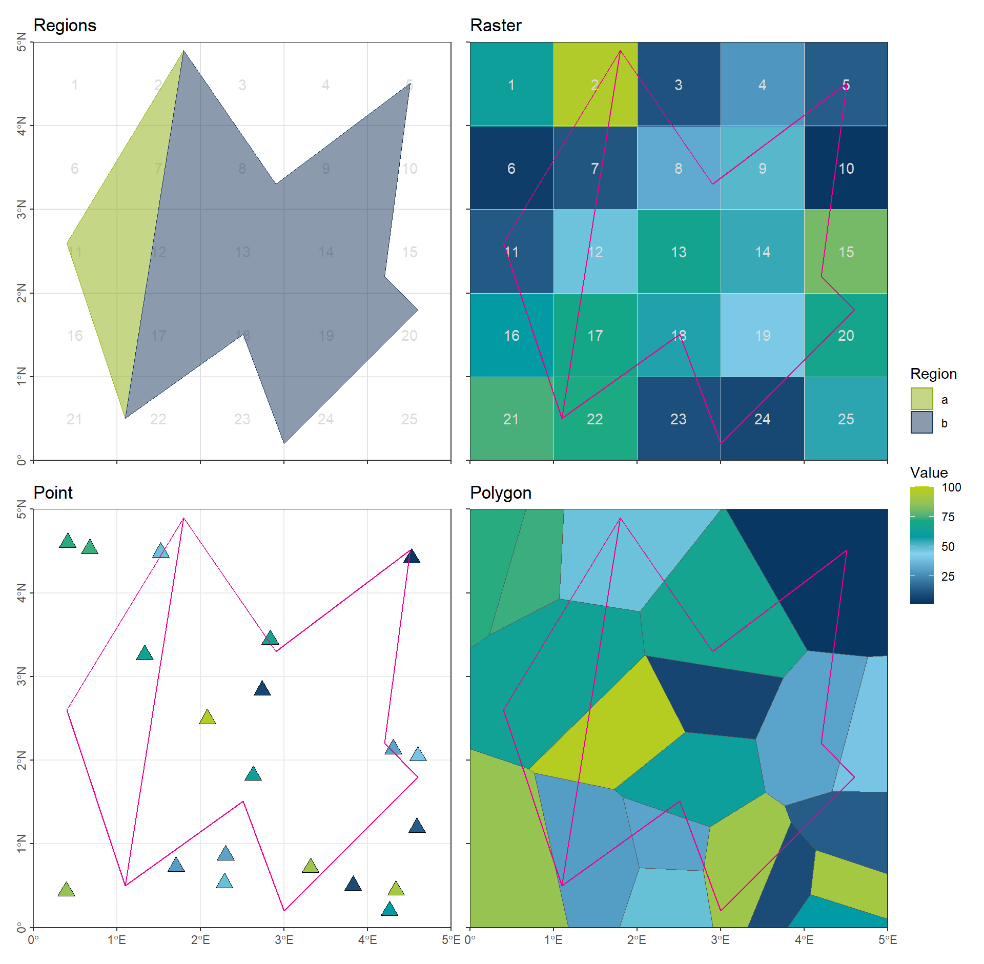 ((gp_Polygon + theme(axis.text.x = element_blank())) | (gp_Raster + theme(axis.text.x = element_blank(), axis.text.y = element_blank()))) / (gp_Point | (gp_Voronoi + theme(axis.text.y = element_blank()))) + plot_layout(guides = "collect")