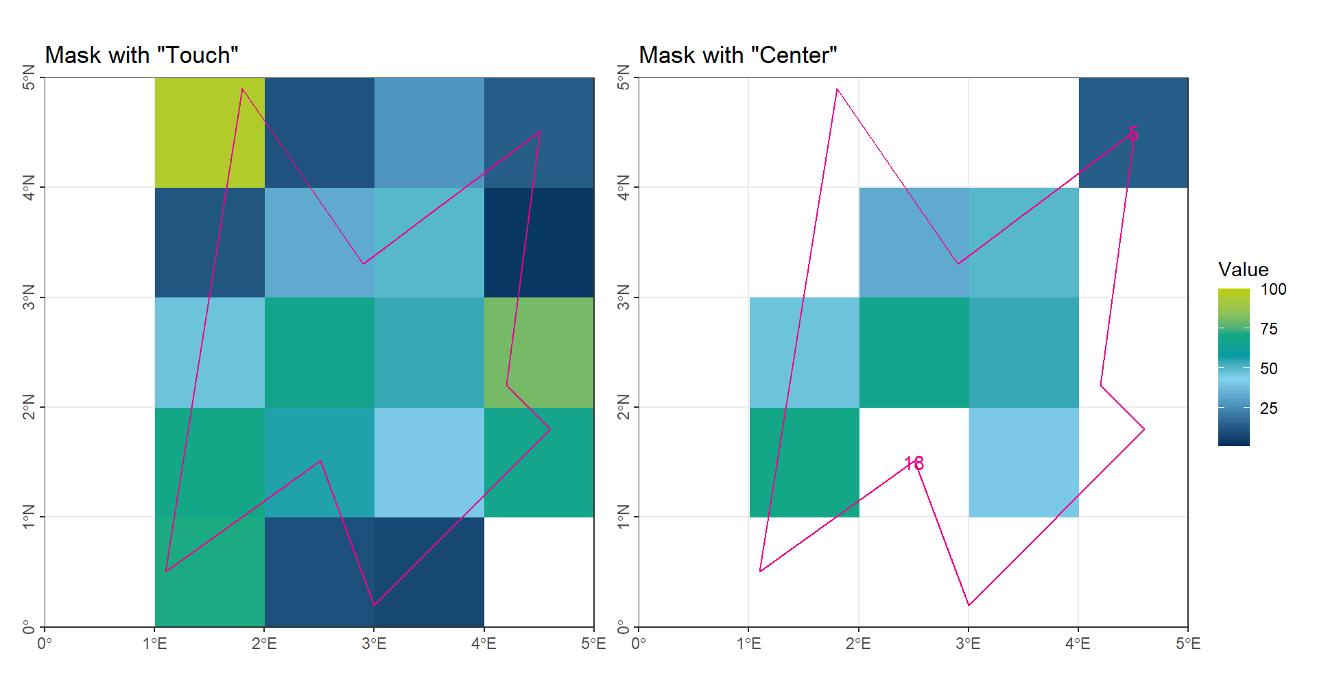 ggtitle('Mask with "Center" (disaggregated raster)') +