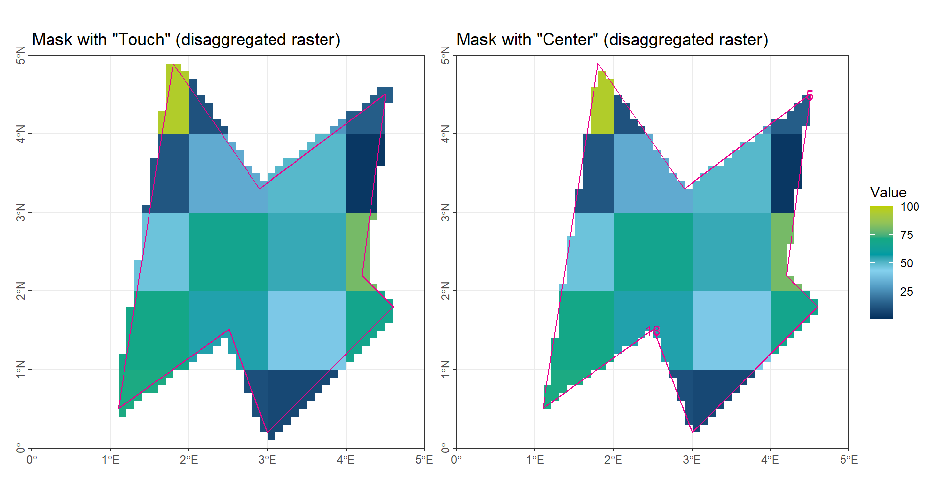 ggtitle('Mask with "Touch" (disaggregated raster)') +