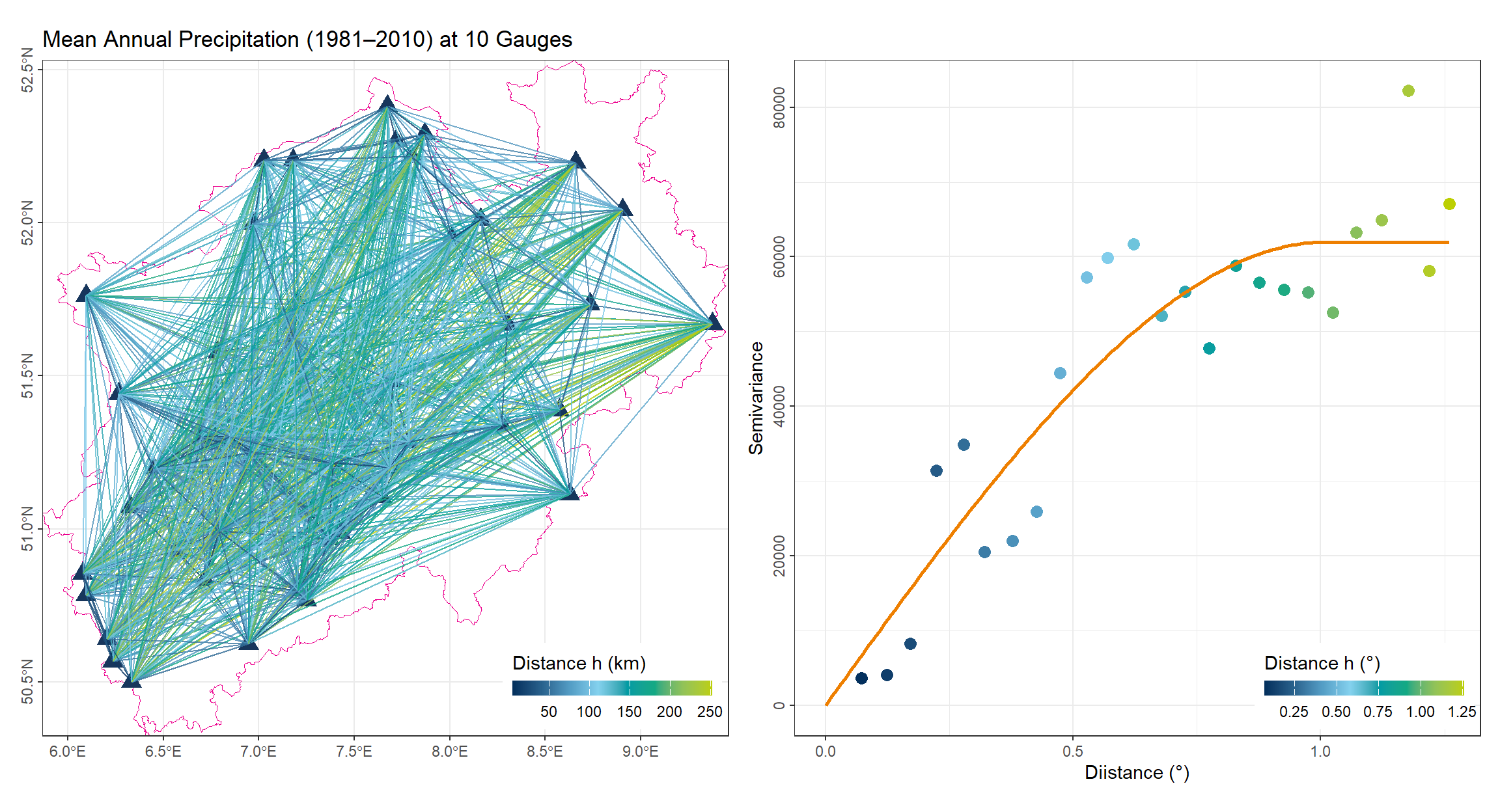 Unlike previous methods (mean, nearest neighbor, IDW), where the weights depend only on distances between the unmeasured point and observed stations, Kriging weights are derived from the spatial structure of the variable itself. This means that for different variables (e.g., precipitation, temperature, soil moisture), even with the same observation locations, the Kriging weights will differ because the spatial correlation patterns are different.