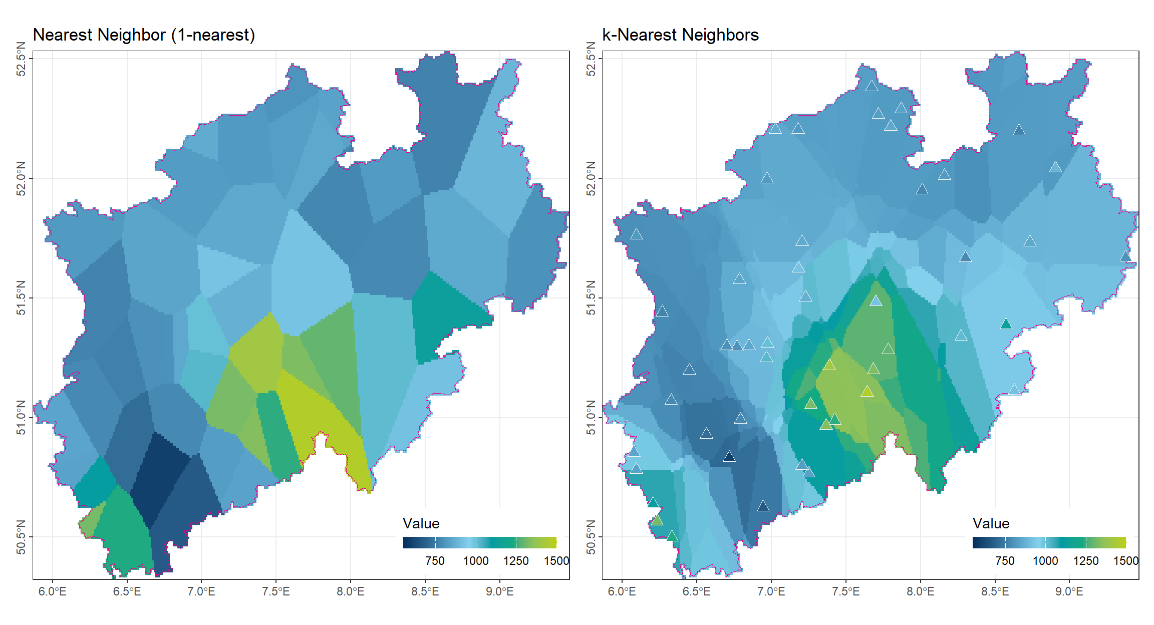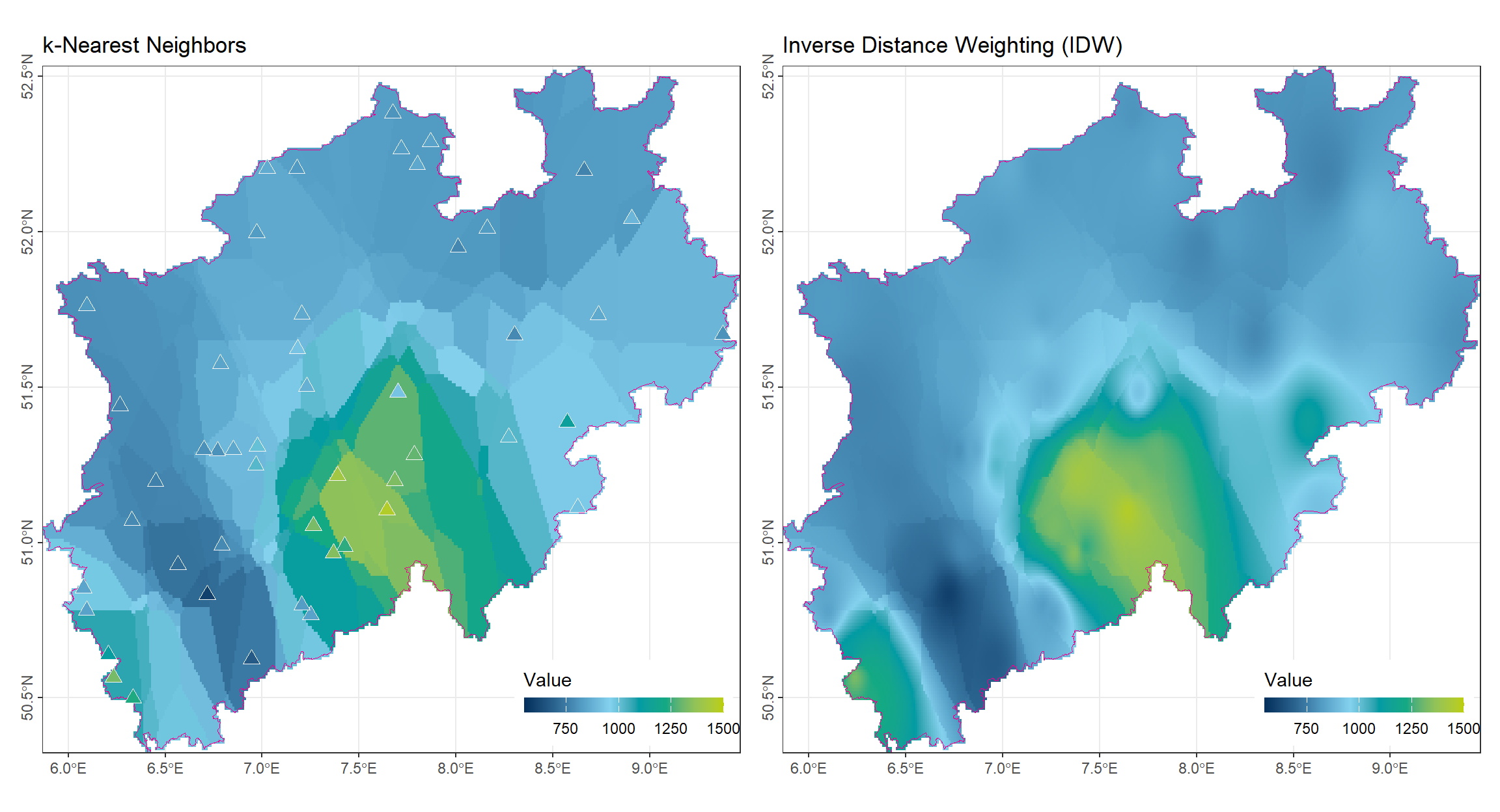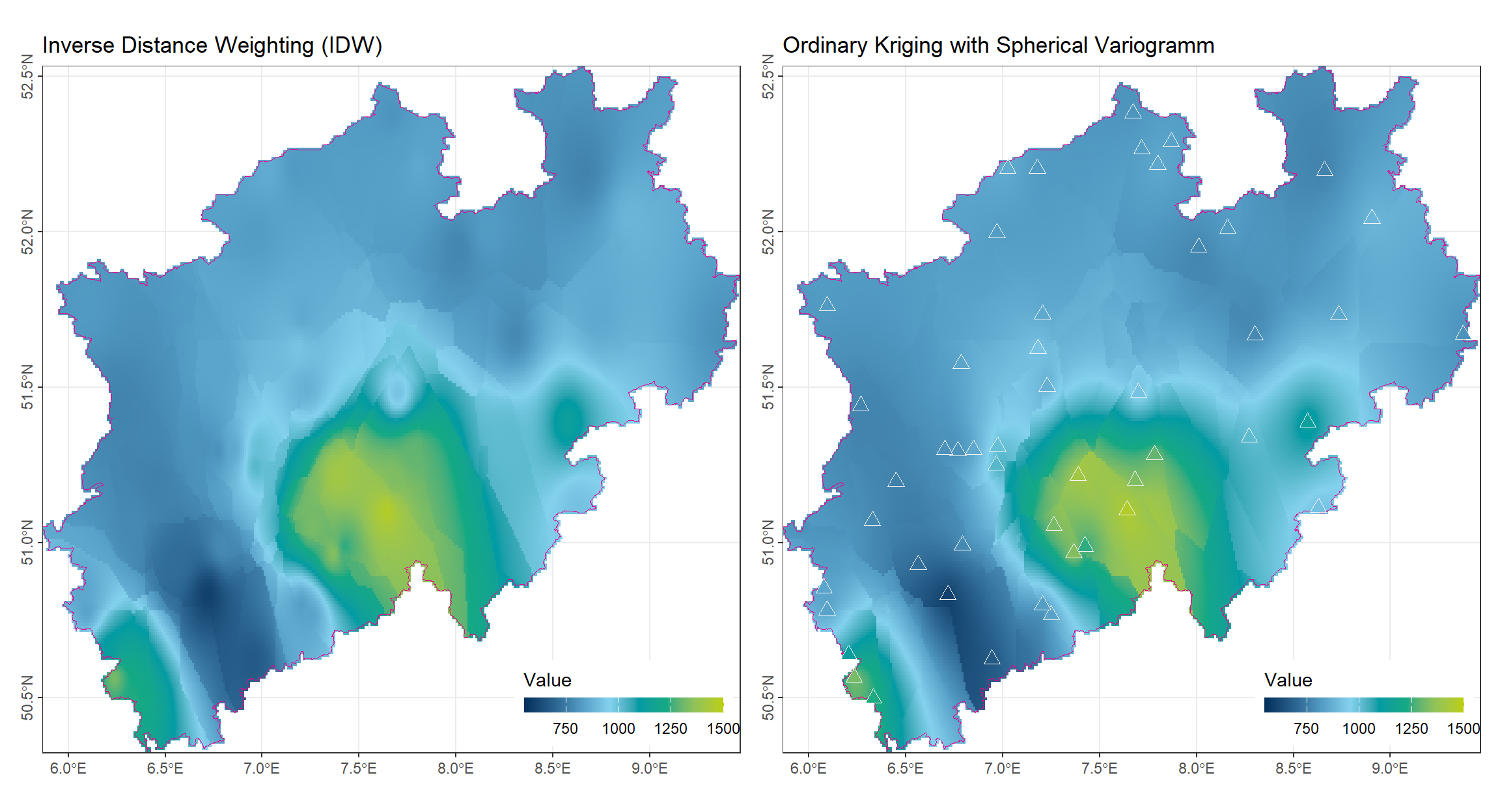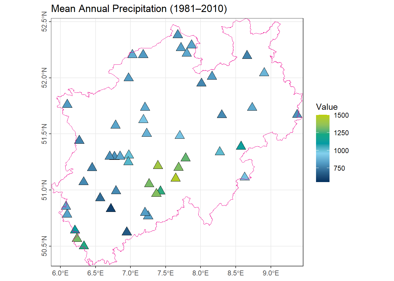 color_DRESDEN <- c("#03305D", "#28618C", "#539DC5", "#84D1EE", "#009BA4", "#13A983", "#93C356", "#BCCF02")To illustrate the concepts of different spatial interpolation approaches, we use the mean annual precipitation (1981–2010) recorded at 10 gauges in North Rhine-Westphalia (NRW).