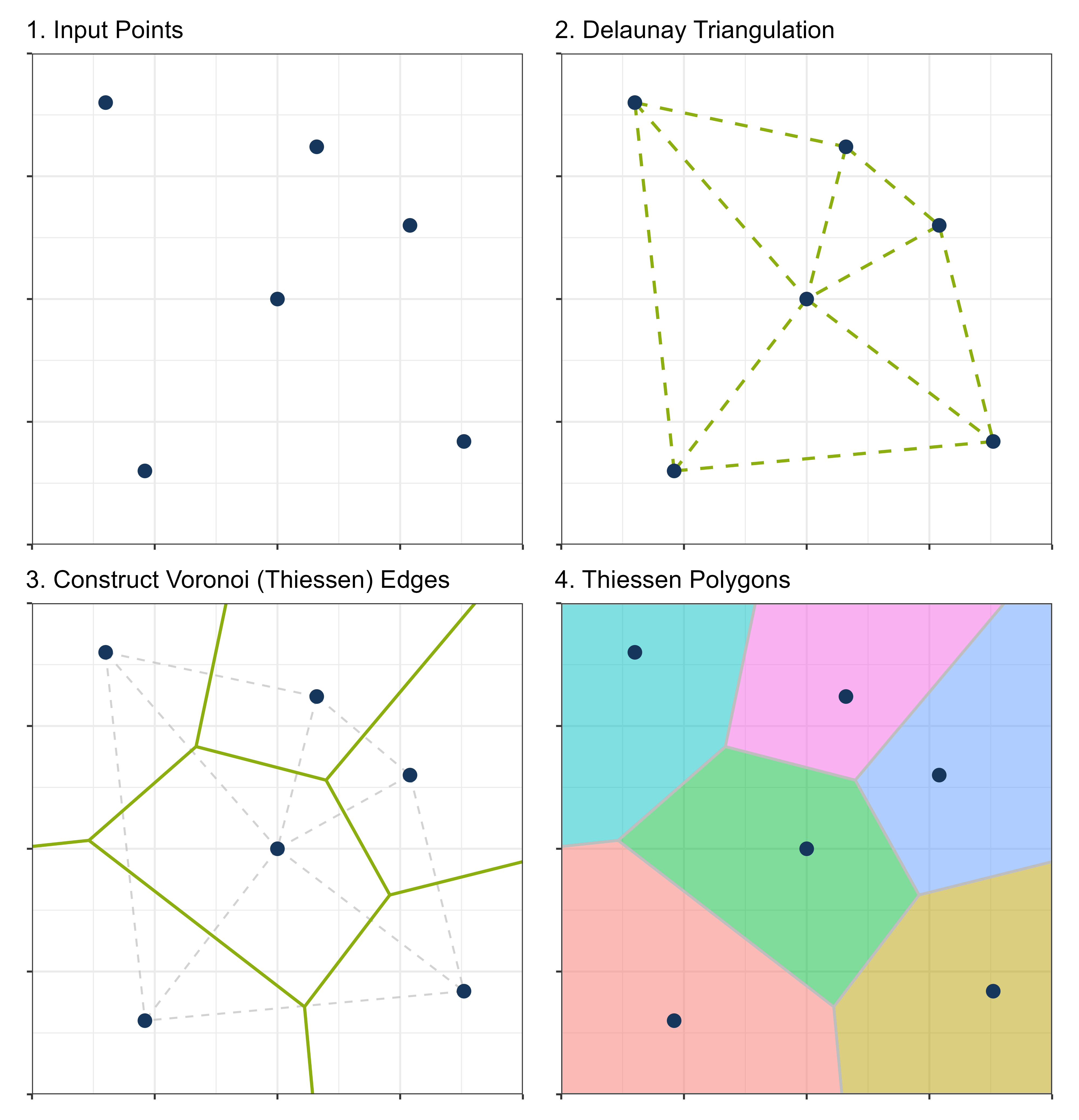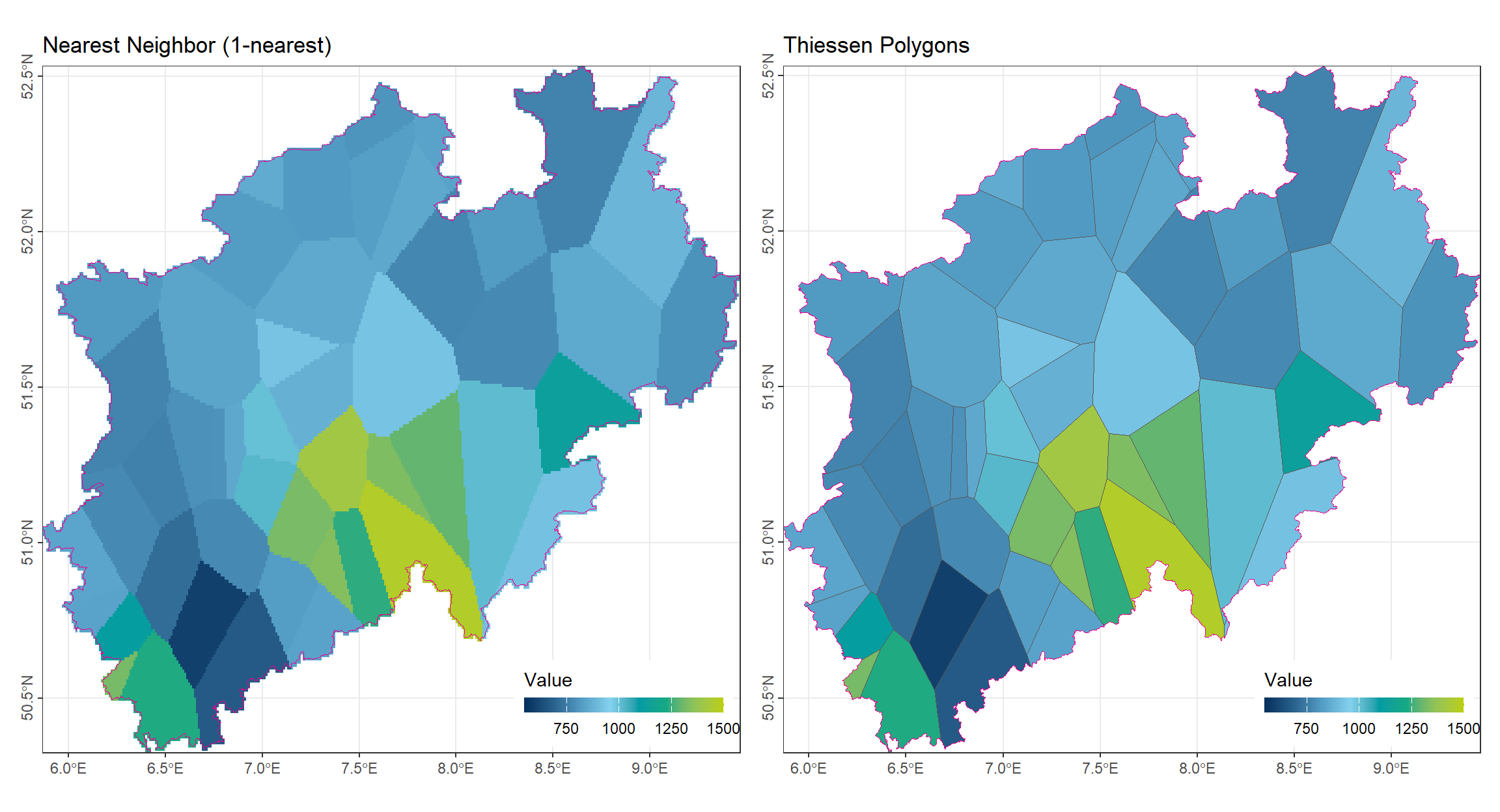 This method assigns the value of the closest observation to the unmeasured location. Within the weighted mean framework, only the nearest point has weight 1, while all others have weight 0: