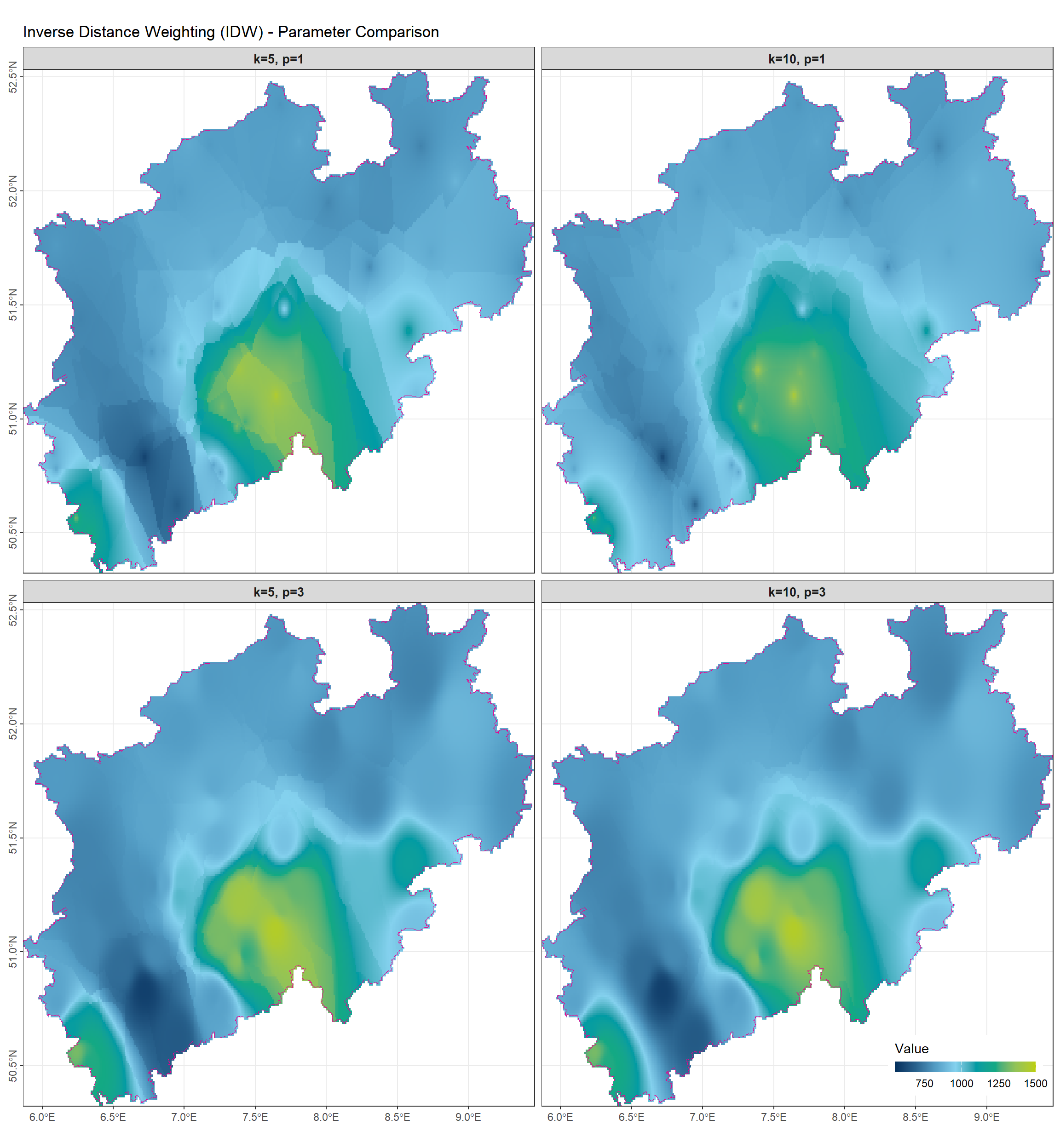 where \(d_i\) is the distance between the unmeasured location and observation \(i\), and \(p\) is the distance weighting power, which controls how quickly weights decrease with distance.