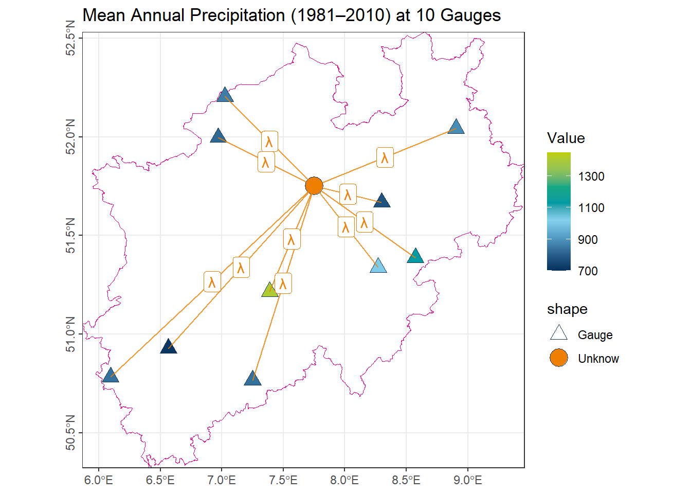 - The labels on the lines indicate the corresponding weights \(\lambda_i\) assigned to each station in the interpolation process.