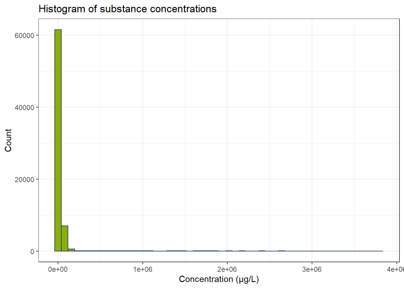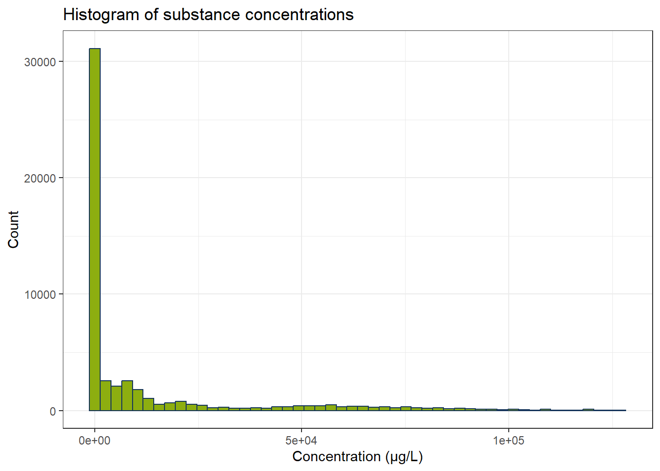 In the dataset there is a large quantity of concentrations below 0.1 µg/L. We still have the concentrations below detectability included. We do not know, what the exact values for the concentrations are in these cases, so we discard the respective rows.