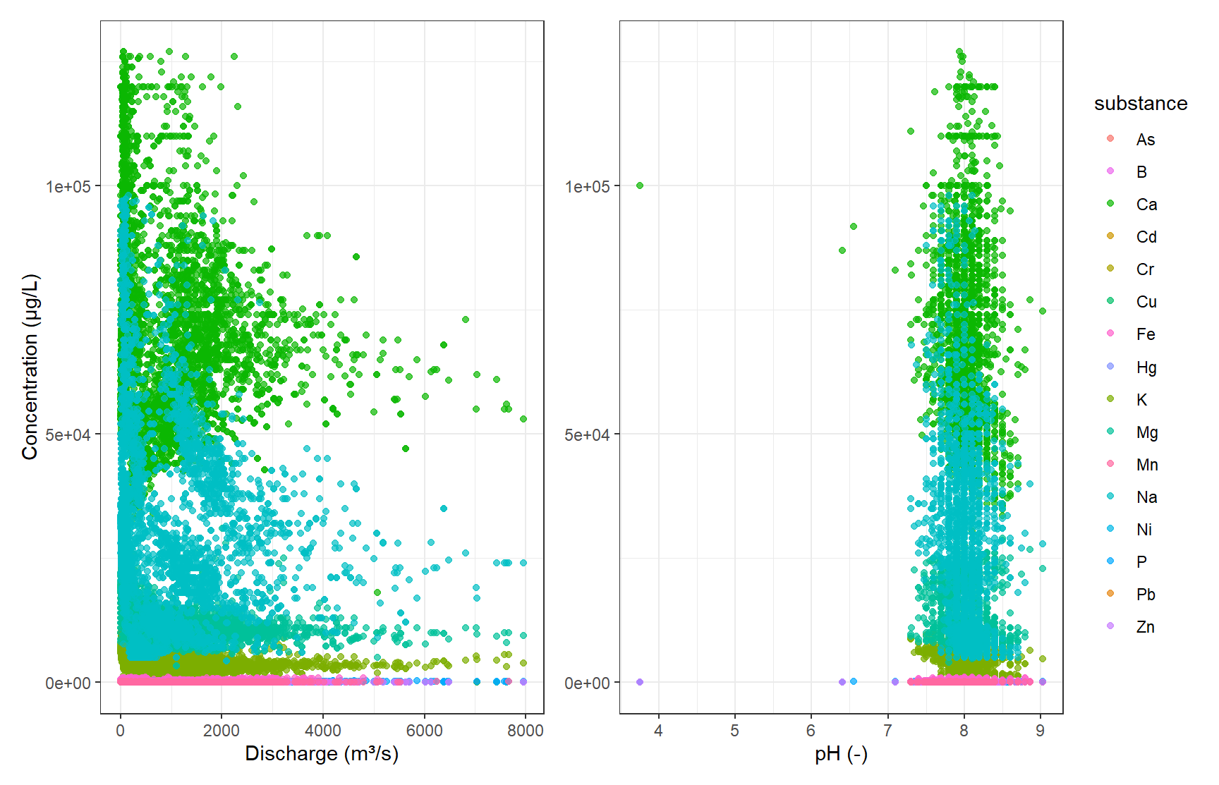 print(paste("All columns:", paste(names(df_Substance), collapse = ", ")))[1] "All columns: sampling_location, river, matrix, sampling_type_discharge, date, unit_discharge, less_than_discharge, discharge, substance, sampling_type_conc, unit_conc, less_than_conc, conc, sampling_type_ph, unit_ph, less_than_ph, ph, load, datetime, year, month, dayofyear, lon, lat"